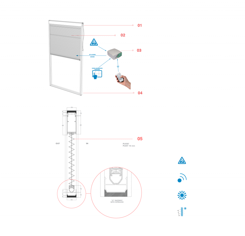 Electronic control unit with 2-4-6-8-10-12 channels to manage movement of blinds and their endblocks. Management of fast automatic function until endblocks or to the desired level and slow single and/or group manual function. Software system with power supply management and safety management in case of accidental blockage of blind. Possibility of movement through wall button or radio control, system can be connected to home automation system.